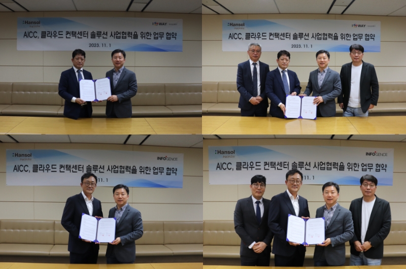 11월 1일 한솔인티큐브 본사에서 아이포웨이, 인포전스와 AICC, 클라우드 컨택센터 솔루션 사업협력을 위한 업무협약을 체결했습니다.